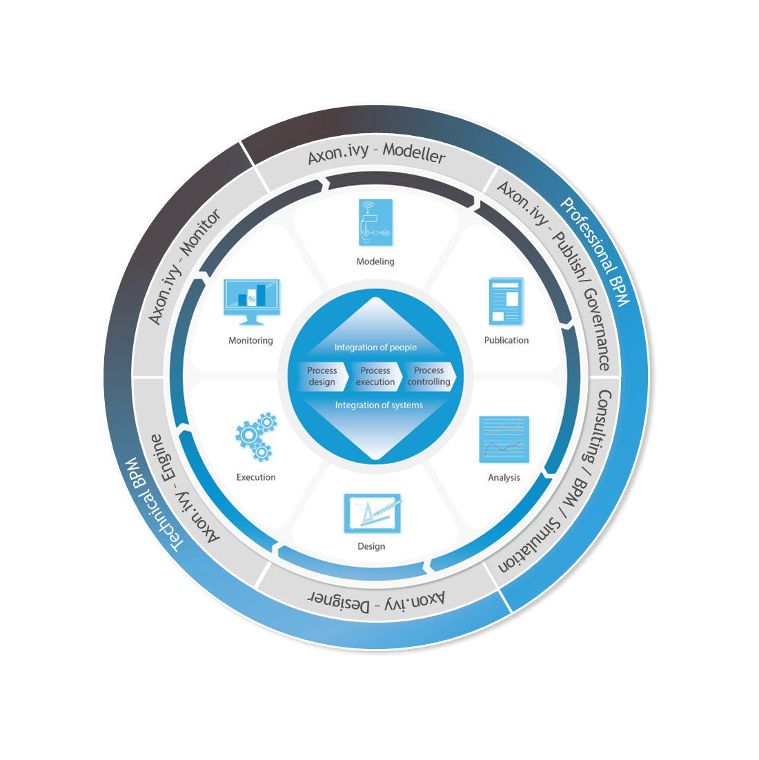 The AXON iVY BPM Suite (Xpert.ivy BPM Suite) supports you with all aspects of process analysis, modeling, optimisation, process execution and monitoring and measurement. It reliably covers all process lifecycle disciplines from process design and process execution, through person and system integration to process controlling– without changes of medium and on one single platform. We wouldn’t have it any other way!